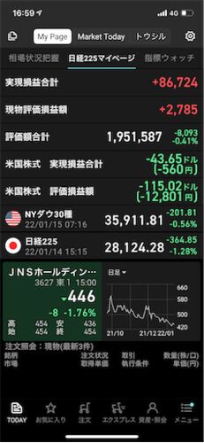 前日評価額 1955675円 本日評価額 1951587円 前月評価額 1976891円 引き出し 50000円 累計利益 24696円